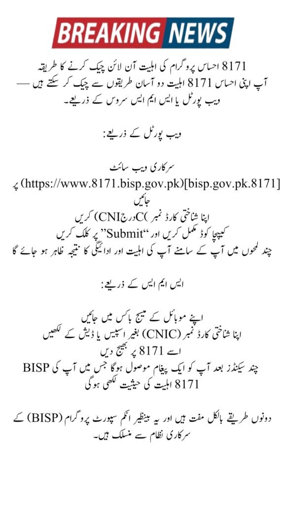 You can check your Ehsaas 8171 eligibility using two simple methods — the web portal or SMS service.