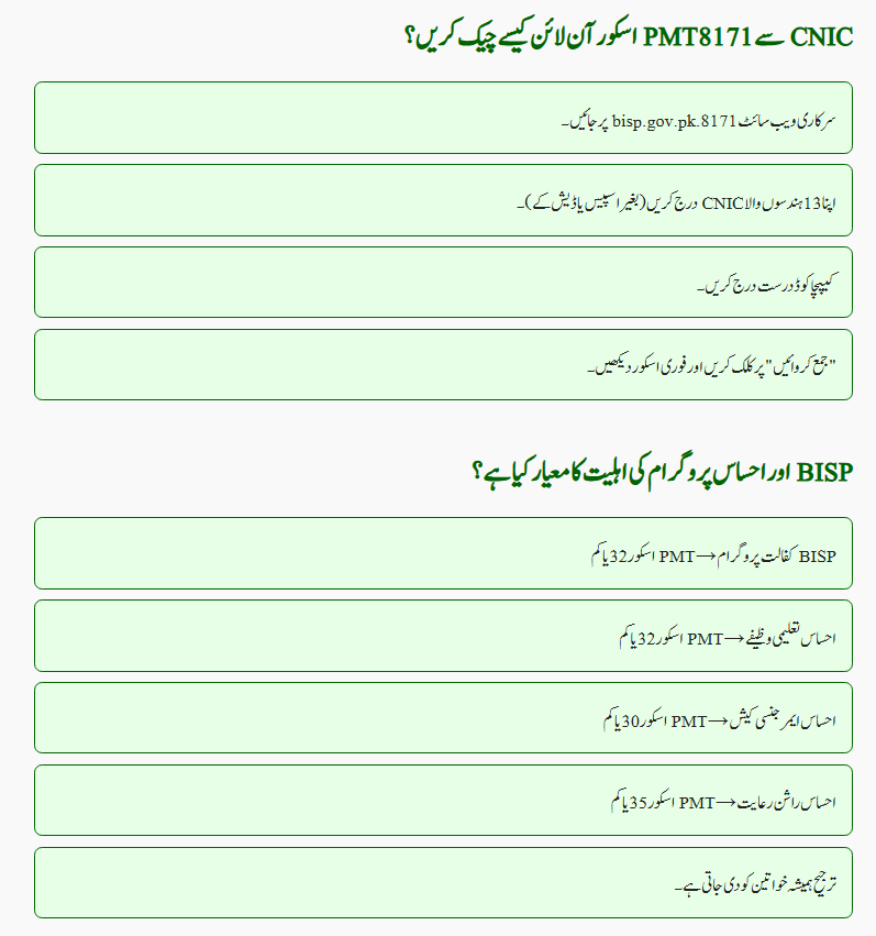 • Ehsaas Taleemi Wazaif → PMT score 32 or below, for children’s stipends.