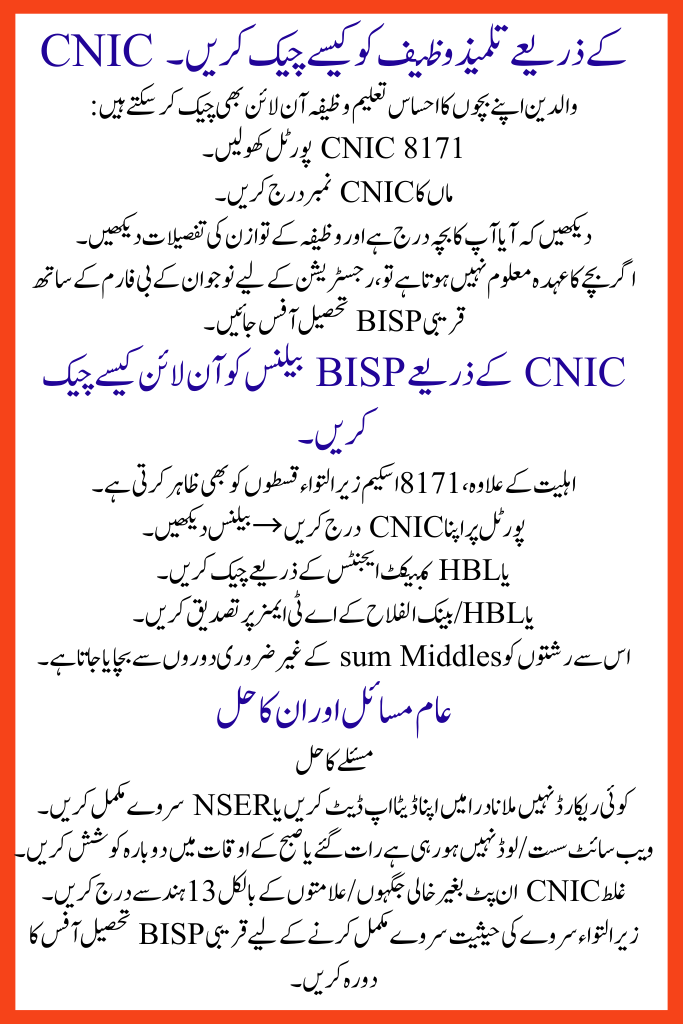 - Delivers school stipends (Taleemi Wazaif) for your children.