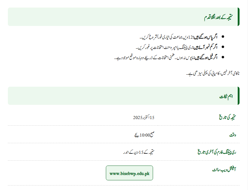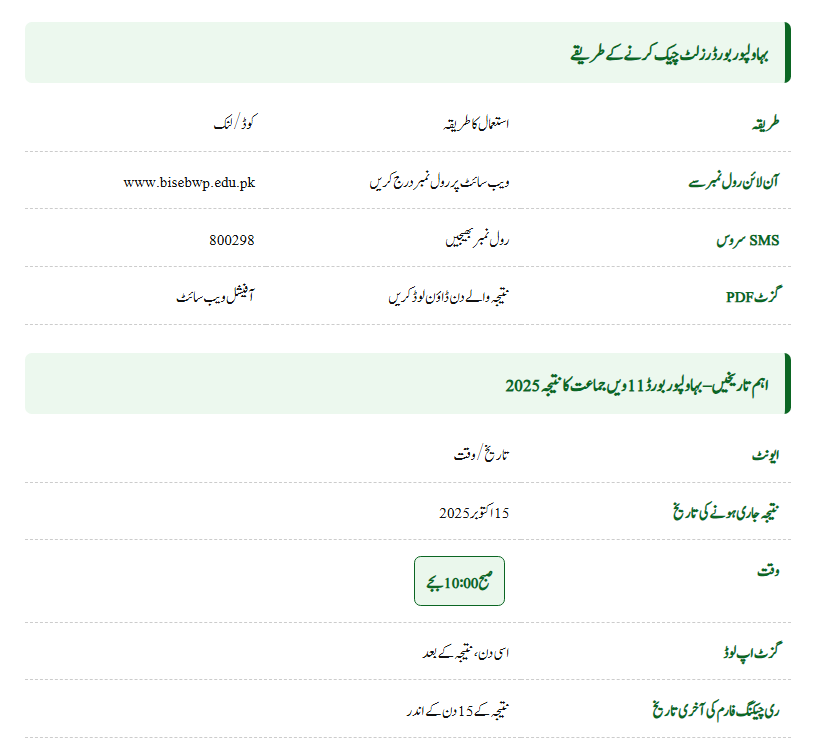 The Board of Intermediate and Secondary Education (BISE) Bahawalpur has officially confirmed that the result will be announced on 15th October 2025 (Friday) at 10:00 AM. On the result day, the website may work slowly due to high traffic. So, students are advised to keep alternate options ready, such as checking through SMS or Gazette.