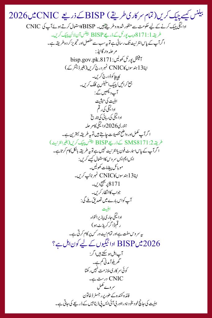 Checking your BISP Balance Status in January 2026 has become much easier and more transparent than before. The Government of Pakistan, under the Benazir Income Support Programme (BISP), has improved both online and SMS systems so beneficiaries can easily check their payment status, eligibility, and balance using CNIC only. Whether you want to confirm your Rs. 13,500 January 2026 installment, check for double payment, or avoid unnecessary visits to banks or campsites, this complete guide explains every official method step by step. This article is especially helpful for women beneficiaries, elderly citizens, and low-income families who depend on BISP payments for daily needs.