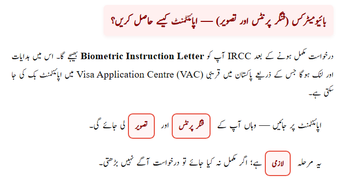 After submitting your application, IRCC will send you a Biometric Instruction Letter (BIL). With this letter, you must book an appointment at your nearest Visa Application Centre (VAC) in Pakistan. During your appointment, your fingerprints and photo will be collected. This step is mandatory—if you skip biometrics, your application will not be processed further.