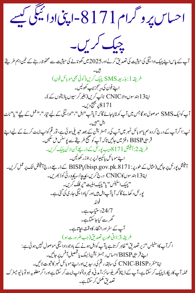 | Ehsaas Program 8171 (BISP) | Ongoing in 2025 | Continuous / quarterly cycle | Approx Rs 13,500 (latest tranche) | Via SMS (send CNIC to 8171), Online portal, In-person at BISP office |
