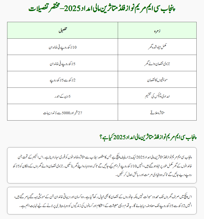 The Punjab CM Maryam Nawaz Financial Aid for Flood Victims 2026 is a special relief package designed to help families who suffered the most from the 2026 floods. Families whose homes were completely destroyed will receive Rs. 1 million each to rebuild their houses, while those with partial damage will get Rs. 500,000 for essential repairs.