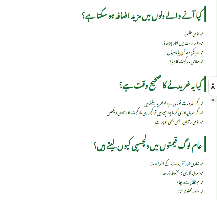 Today, the gold price in Pakistan increased strongly due to global demand and expected changes in US policy. Whether you are planning to buy or invest, it is important to check daily updates and follow current trends. The coming days may bring more price movement.