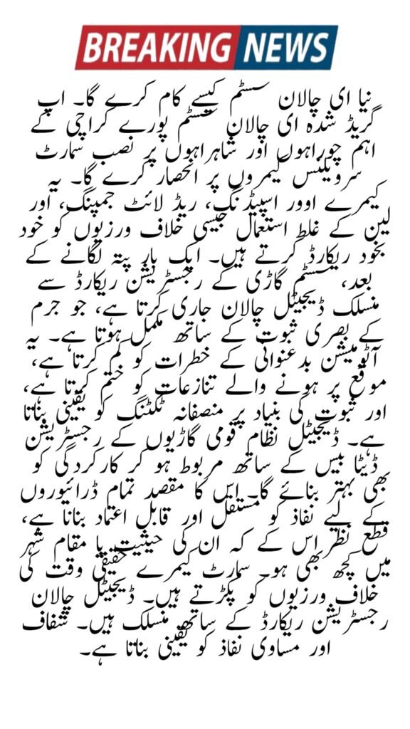 The upgraded E-Challan system will rely on smart surveillance cameras installed at key intersections and highways across Karachi. These cameras automatically record violations like overspeeding, red-light jumping, and lane misuse. Once detected, the system issues a digital challan linked to the vehicle’s registration record, complete with visual proof of the offense. This automation reduces corruption risks, eliminates on-spot disputes, and ensures fair ticketing based on evidence.