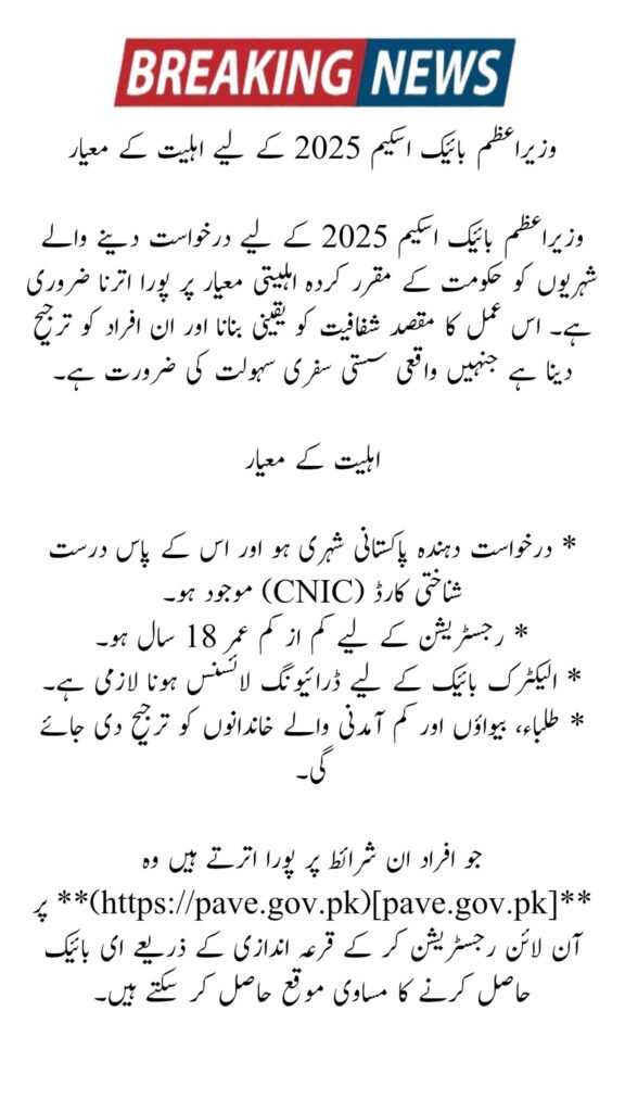 Those who meet these conditions can register on pave.gov.pk and get an equal chance to receive an e-bike through the online draw system.