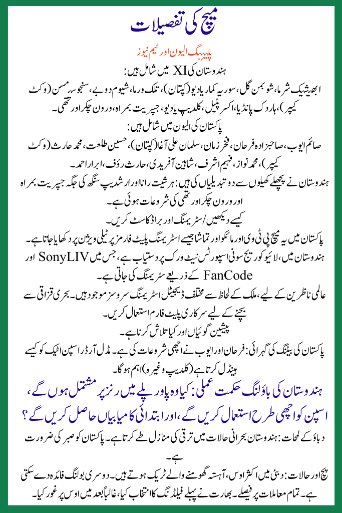 Key MomentsIndia refused handshake again; Pakistan had a good start in powerplay; India’s changes in playing XI including Bumrah & Varun coming back