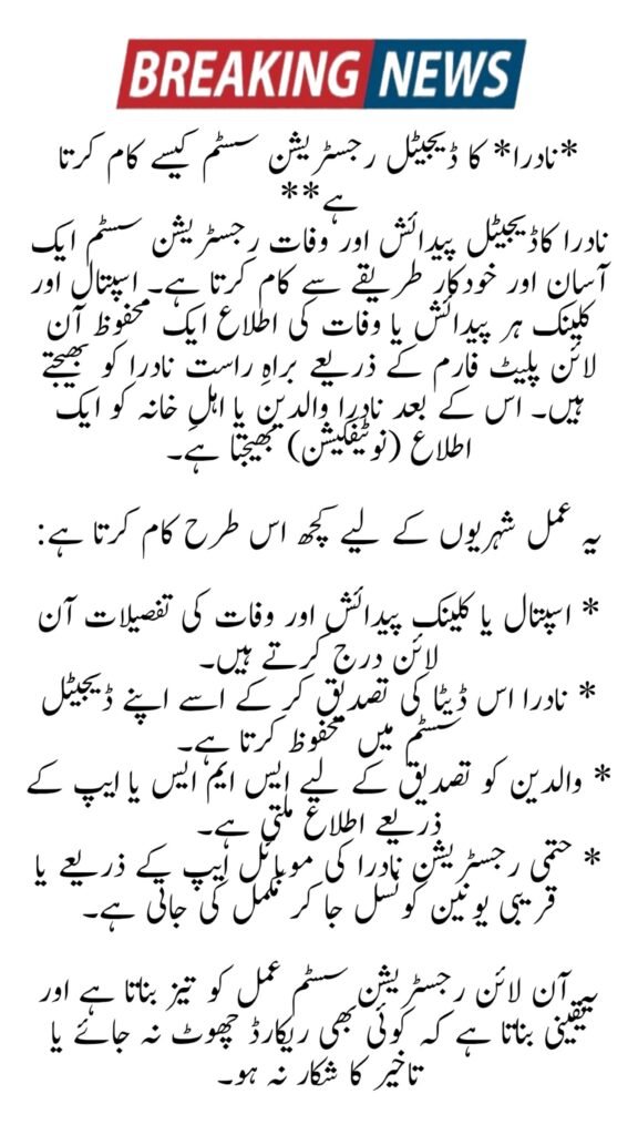 The NADRA Digital Birth and Death Registration System works in a simple and automatic way. Hospitals and clinics report every birth or death directly to NADRA through a secure online platform. After this, NADRA sends a notification to the parents or family members.