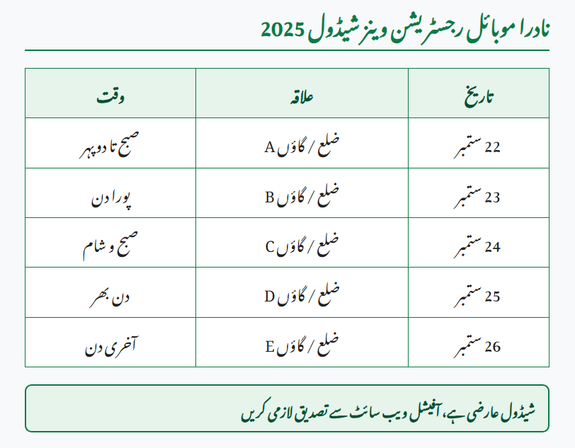 According to NADRA, mobile vans will visit different rural areas from 22nd to 26th September 2025. The tentative schedule is: