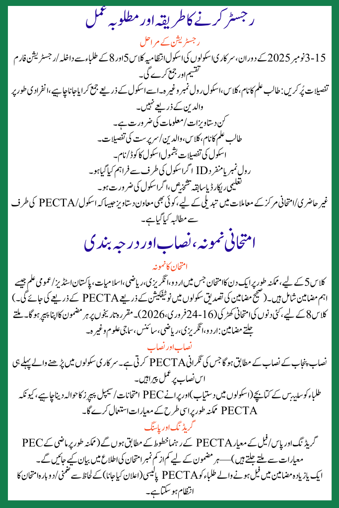 • For Class 5, likely single day exam covering major subjects like Urdu, English, Mathematics, Islamiat, Pakistan Studies / General Knowledge. (Exact subjects to be confirmed by PECTA through notification in schools.)