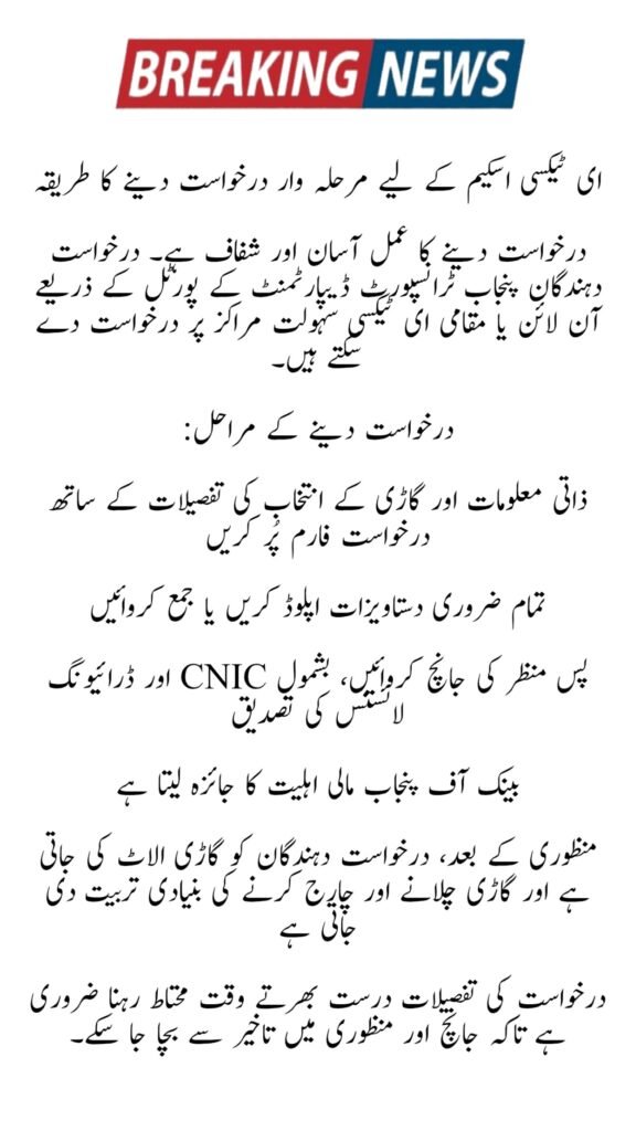 The application process is simple and transparent. Applicants can apply online via the Punjab Transport Department portal or at local E-Taxi Facilitation Centers.