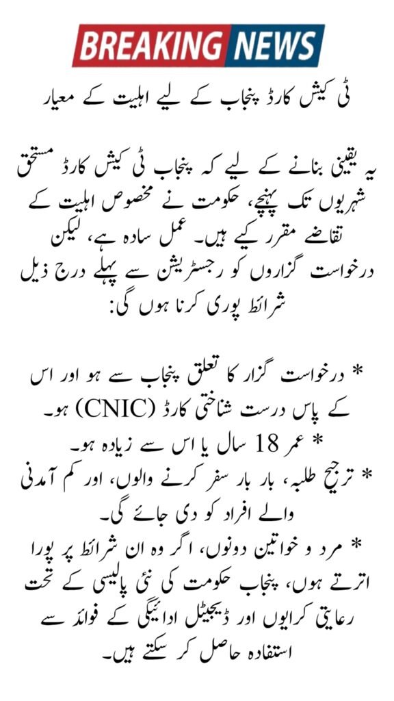 To make sure that the Punjab T Cash Card reaches deserving citizens, the government has set specific eligibility requirements. The process is simple, but applicants must meet the following conditions before registration: