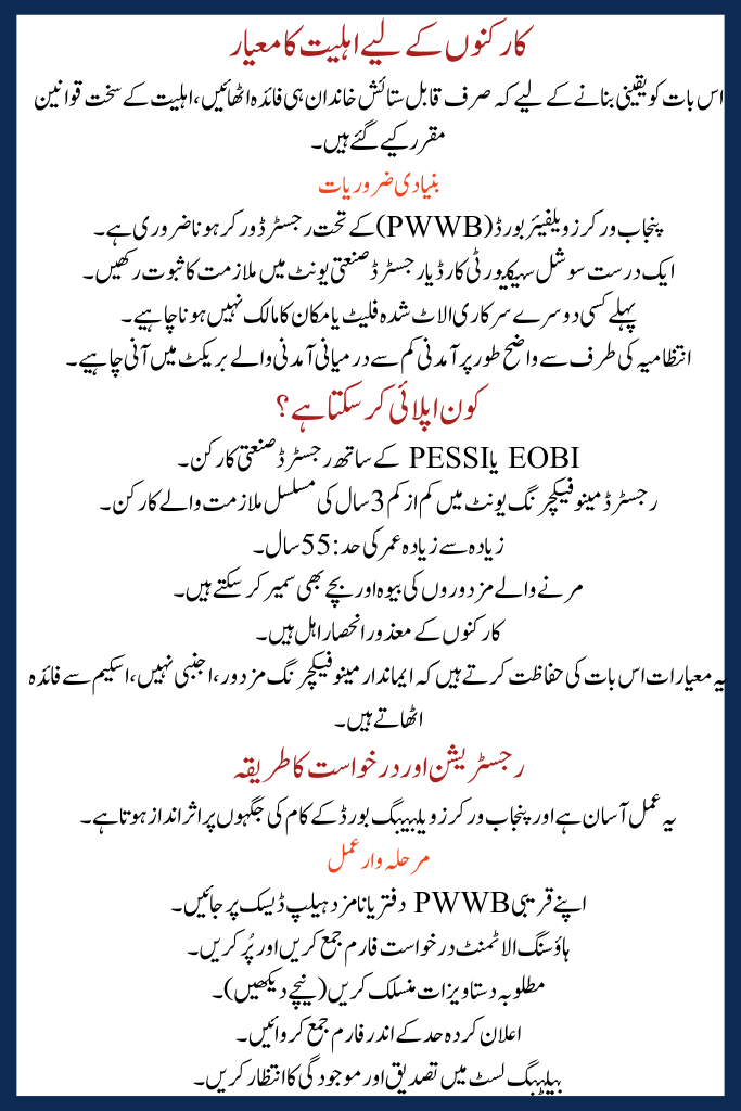 - Must be a registered worker under Punjab Workers Welfare Board (PWWB).