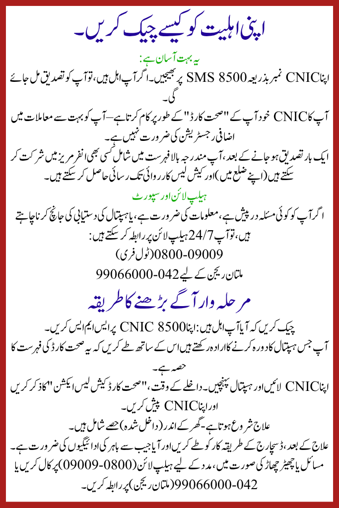 - Check if you are eligible: SMS your CNIC to 8500.