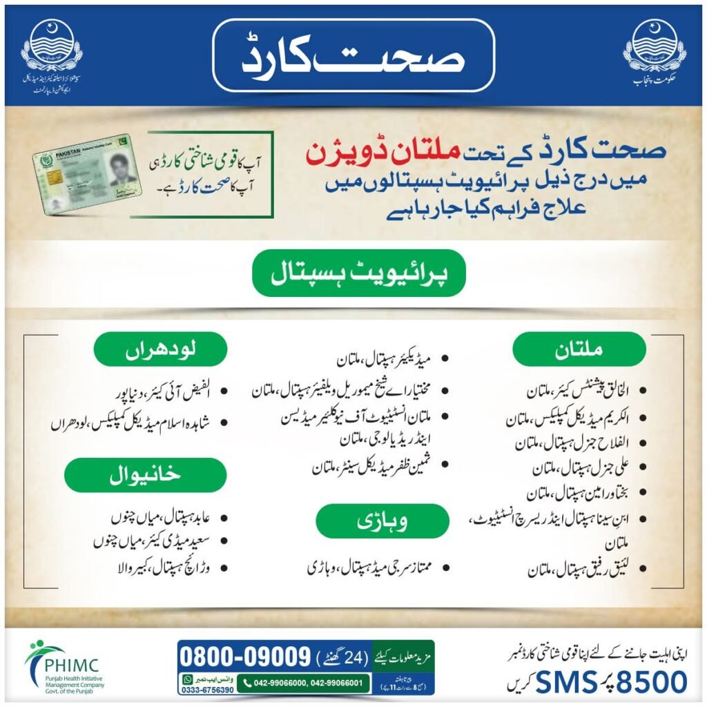 | Sehat Sahulat Program (Multan Division rollout) | Ongoing / recently expanded | No fixed end date announced | Free cashless treatment (subject to hospital & scheme limits) | Online/Offline: send CNIC via SMS to 8500 OR present CNIC at empanelled hospital |